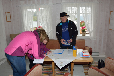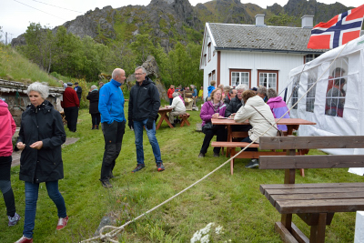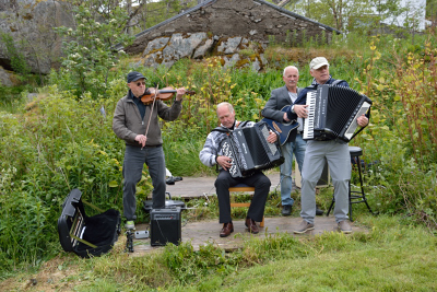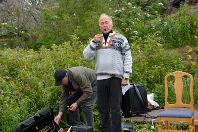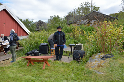 Lederen i historielaget gjør seg klar til å åpne årets Skaftnesdag.         Nappstrumen Spellemannslag sto for første innslag.