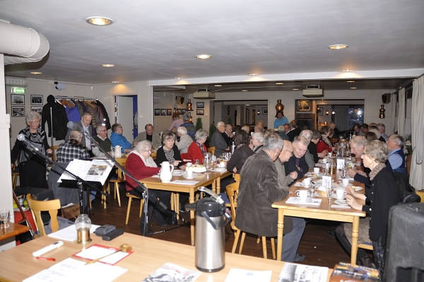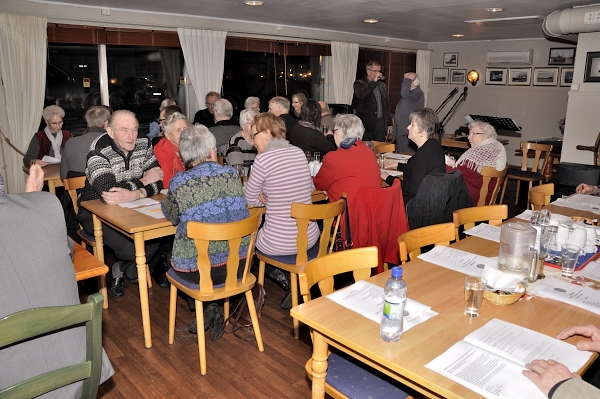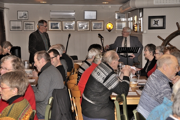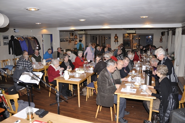 Før en god matpause med snitter, bløtkake og kaffe sang vi Ivar Aasens ”Til lags åt alle”. Tror serveringen falt i smak hos hele forsamlingen, skal vi tolke lydnivået under ”kaffedrøsen”.
