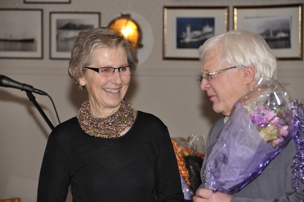 Herbjørn Alstad har vært medlem i Årbokredaksjonen i mange år. Nå er han varamedlem. Gunn Silsand Bugge overrakte blomster.