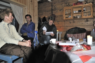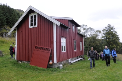 Innerst i dalen finner vi et fint og rødmalt hus som er renovert og står og minner om en tid da det var god aktivitet og fast beboelse der.. Nå er det fritidshus, og gjestfriheten til huseierne gjorde at vi fikk komme inn for å nyte vår kaffe i trivelig og historiske omgivelser. Her fikk Terje gi oss flere detaljer om dalens historie - en gjennomført god oppdatering fra en svunnet tid, der folk enda så mulighetene for å ha et sted å bo og et utkomme ,selv om det nok kunne være slitsom og knagert til tider.