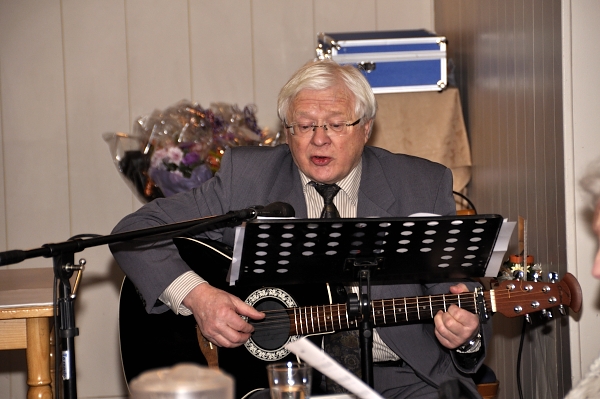 Årsmøtet ble startet med en allsang. Historielagets leder Kolbjørn Bugge akkompagnerte på gitar.