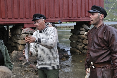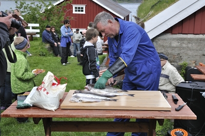 Så stor takk til initiativtakerne. Videre ble det avsatt tid til å tilberede fangsten, og her viste Ole Berglund hvordan filetering og flekking utføres. Et særdeles lærerikt innslag med mange interesserte tilskuere. Videre var det smaksprøver på tørrfisk som Ernst Z. hadde ansvaret for. Grillede fiskekaker fra Lofotprodukt var det også mulig å smake på sammen med lofotkokk Frank Olsen. I tillegg er Svein Kongsjord alltid tilstede med sin kunnskap på mange felt.
